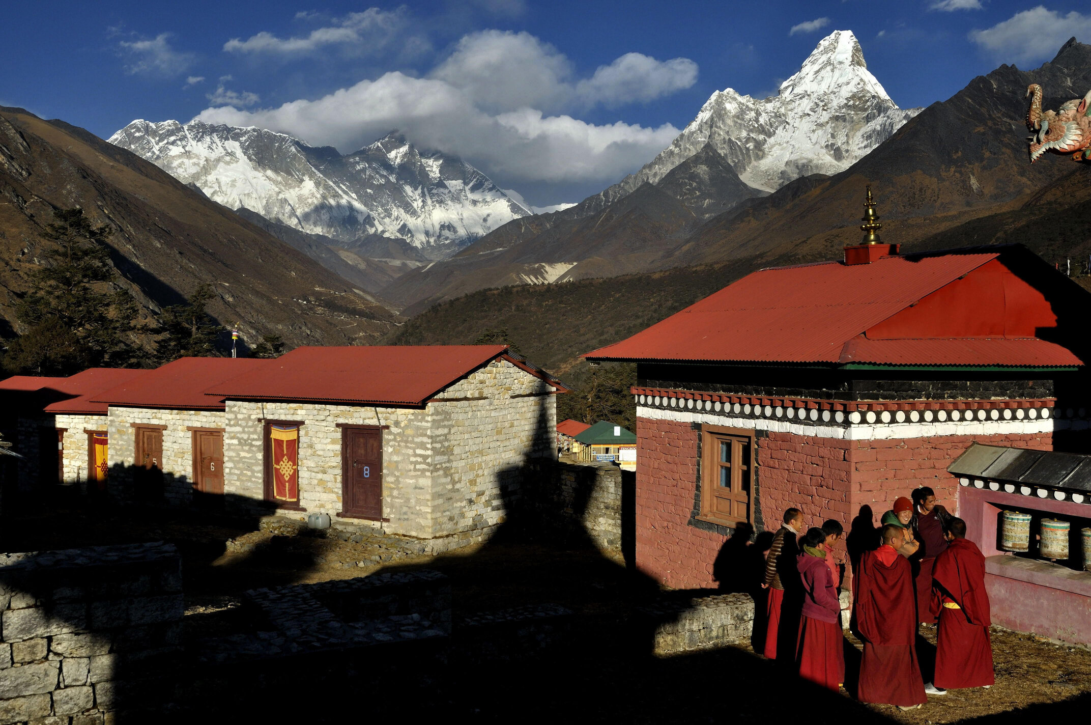 Tengboche monastery triumphantly straddles a steep saddle overlooking Mount Sagarmatha, the heart of Sherpa heritage and religion. Its Rinpoche was born on the same day as His Holiness the Dalai Lama in 1935 to a Sherpa family in Namche – named Passang Tenzin and later ordained Ngawang Tenzin Zangbu.