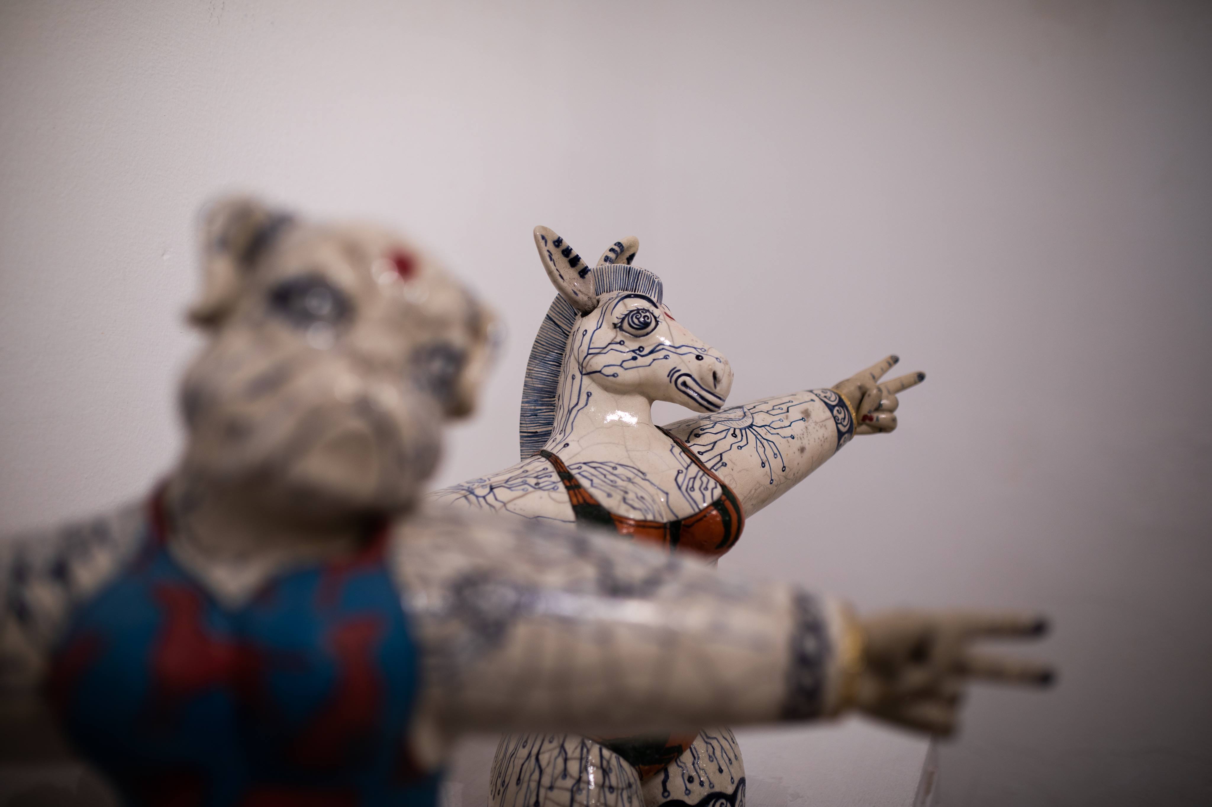 In the centre of the room of the ground floor at Siddhartha Art Gallery, tattooed ceramic female figures stretch languidly astride grazing horses.