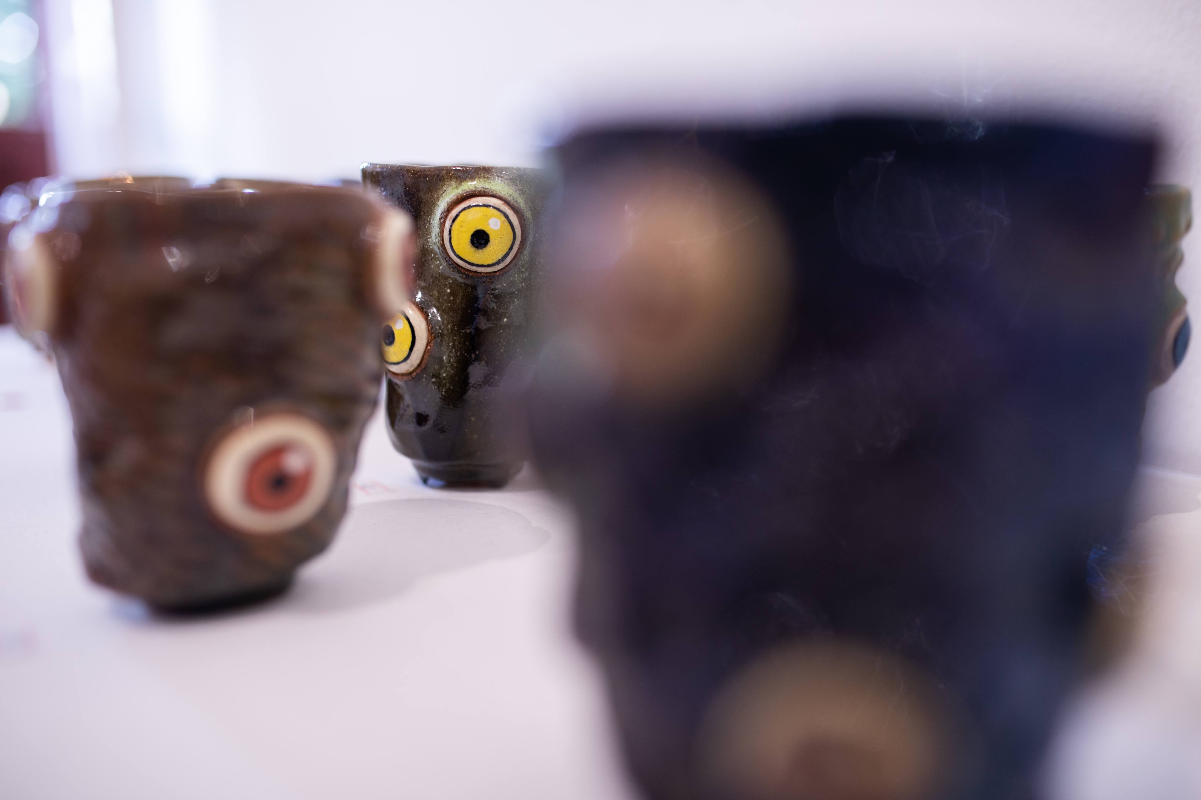 Alien creatures, a concept he has been working with since the beginning of his artwork, also feature on canvas as one-eyed ceramic creatures standing solemnly alongside the cheerful lion-dogs, and as pastel coloured vases covered in eyes, bearing sharp teeth.