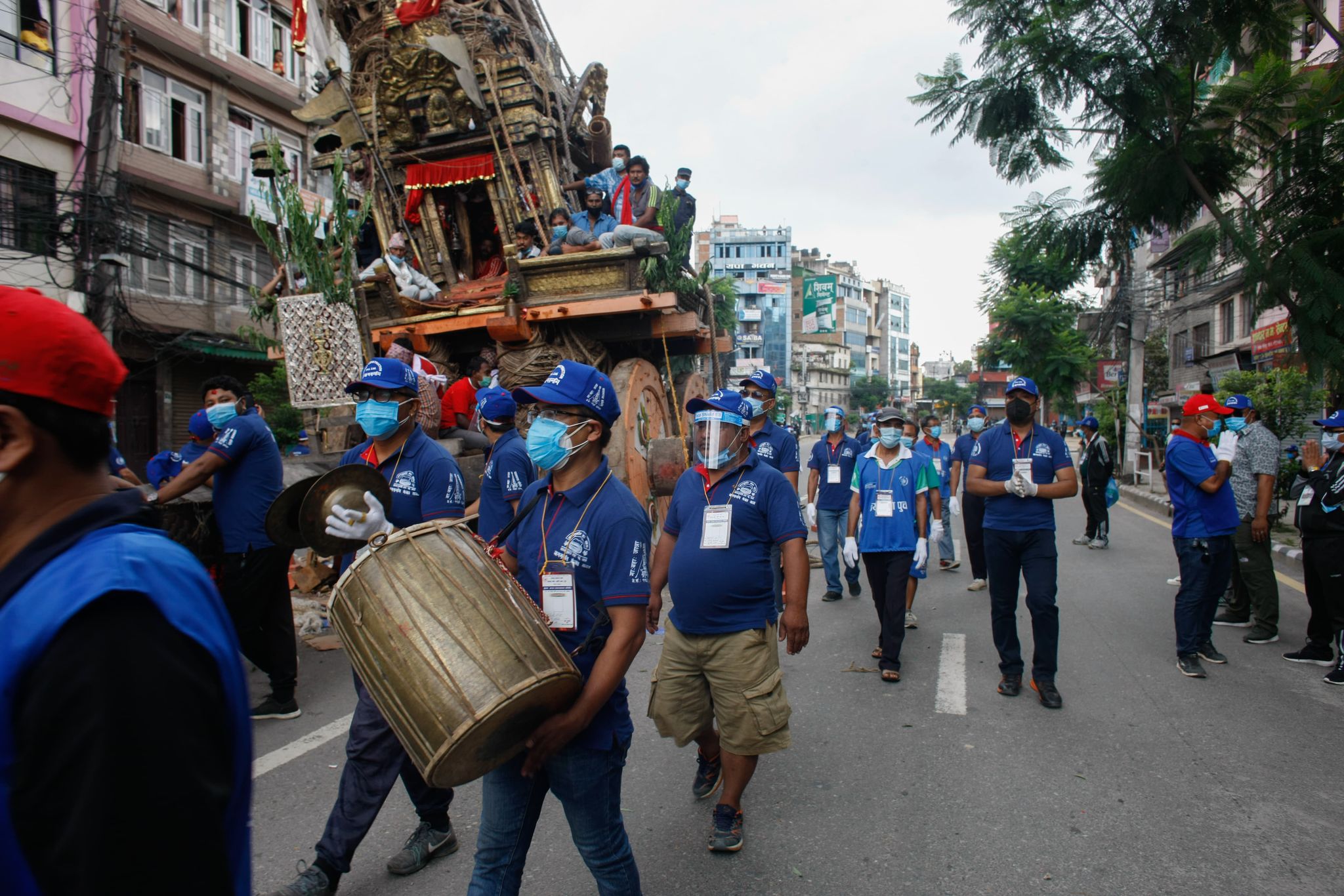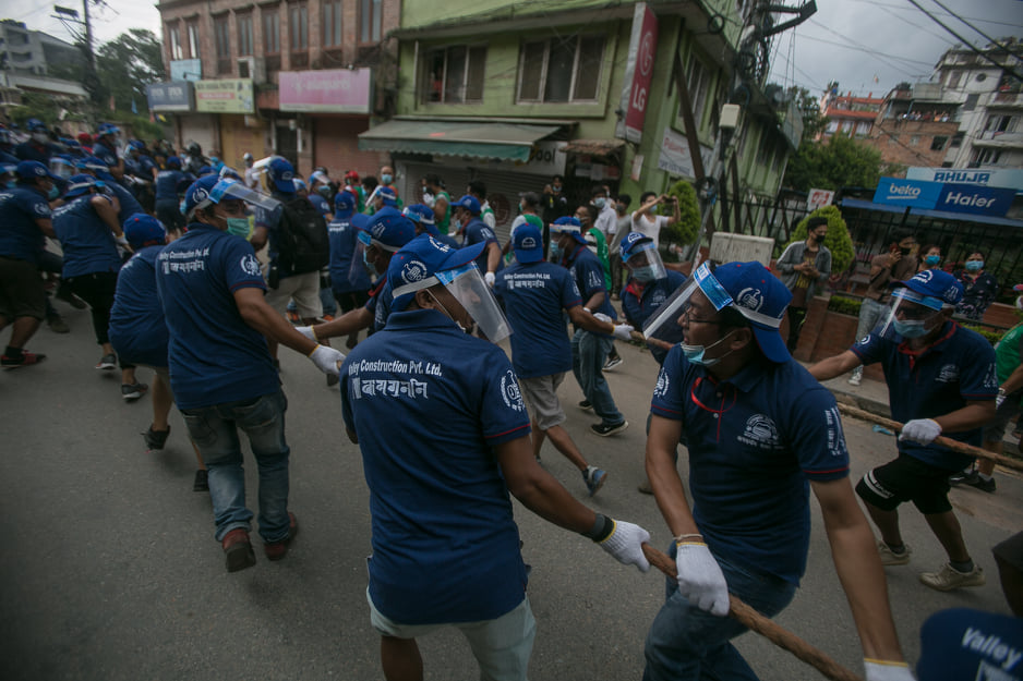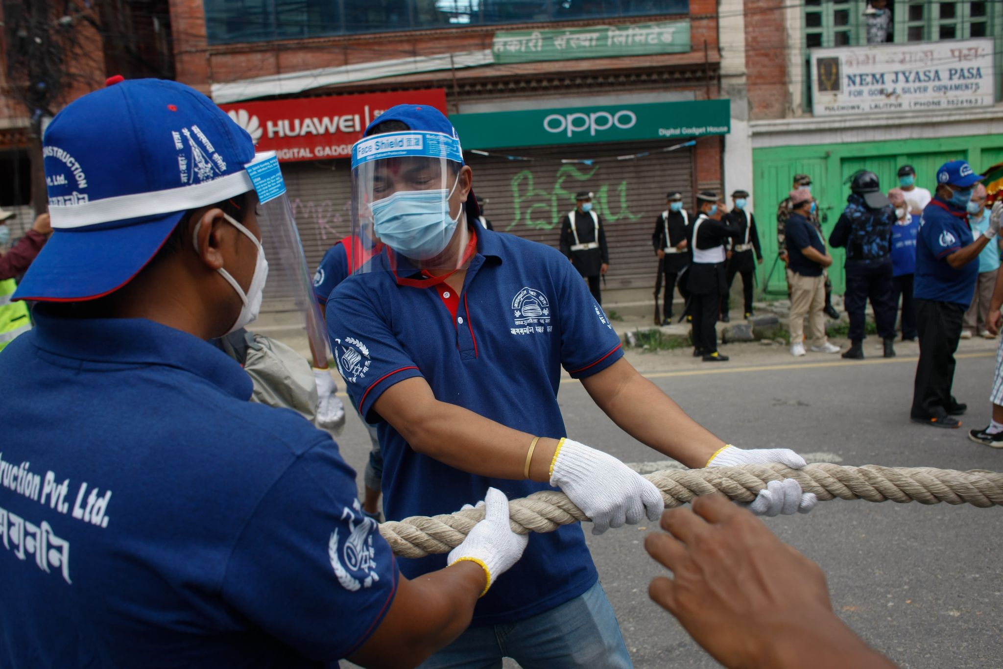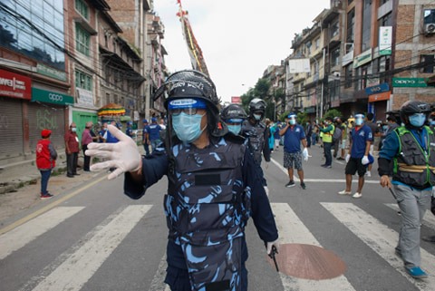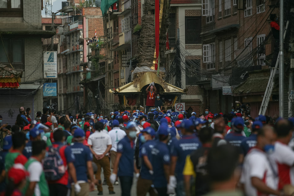 The procession site starting from Pulchok where the chariot had stopped on Thursday was heavily patrolled by Armed Police Force in riot gear. A total of 438 people had gathered for the procession: 160 of them to pull the chariot, 124 volunteers, 28 musicians and 122 officials from the Jyapu Samaj.