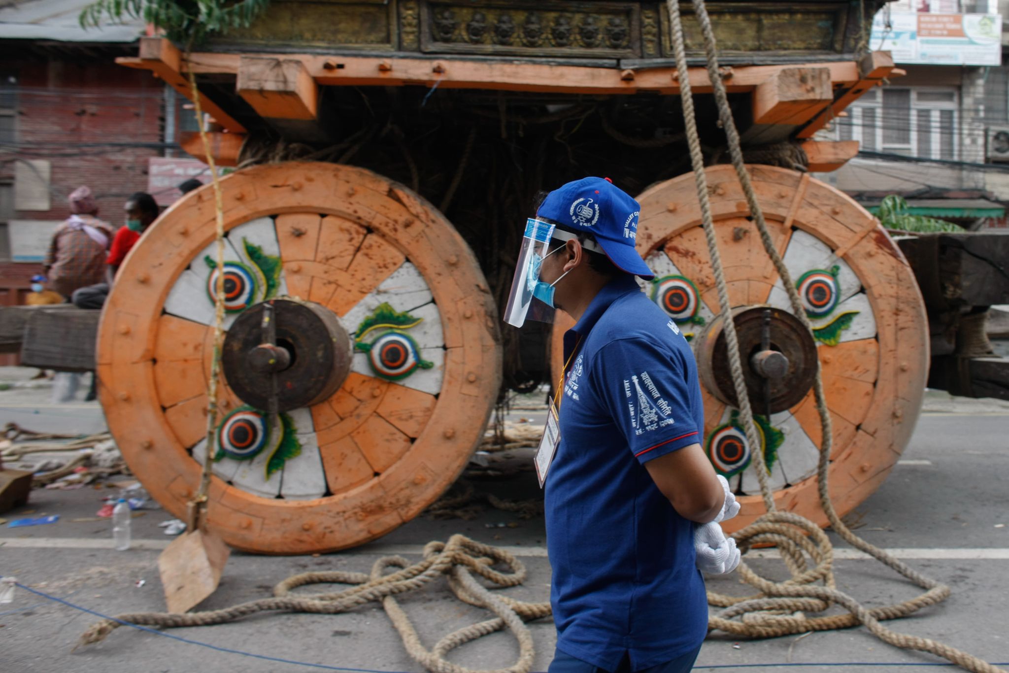 The chariot pullers were wearing face shields, gloves and masks, maintaining distance on the ropes and devotees were not allowed to gather to watch. The festival, which was suppsoed to take place in May had to be postponed repeatedly because of the Covid-19 lockdown.