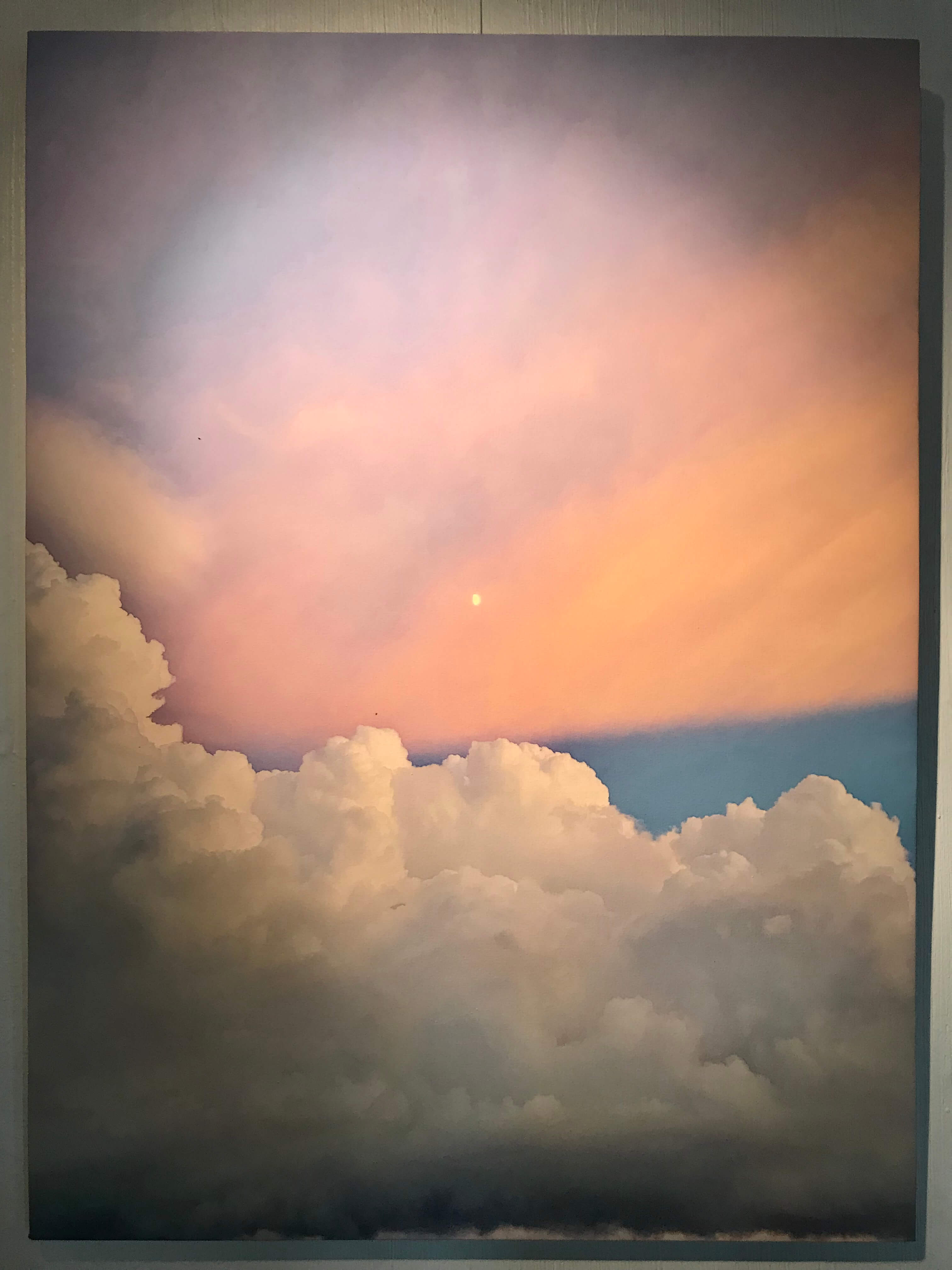 Right across are two more canvases ‘Was Good Till It Lasted’ which show markedly different skies in juxtaposition to the striking blue. The colours are warmer, with swirling shades of pink, orange and purple, like the ether in twilight or breaking dawn.