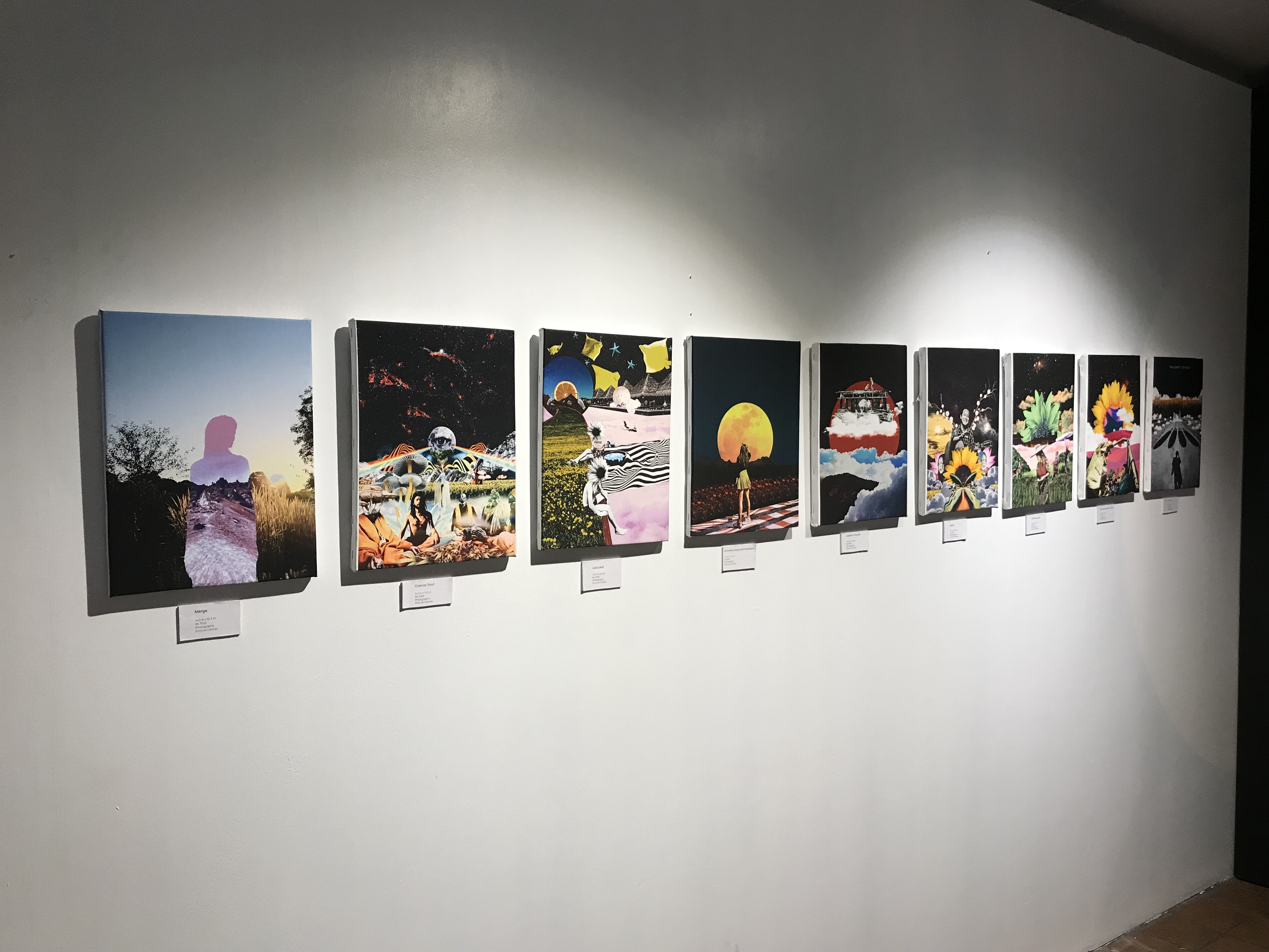 Drawing in from Pradhan’s vast experience in photography and videography, the exhibition is an intriguing cross-genre excursion. At the centre of the gallery, a video of clouds in motion is projected on to the wall, and in the adjoining chamber a series of nine works displaying absorbing experimentation with form and content. Clever collages, almost psychedelic in nature, ask the viewers to interact with spirituality and consciousness. Declutter your mind, they seem to say, and open yourself to a dazzling alteration of themes.
