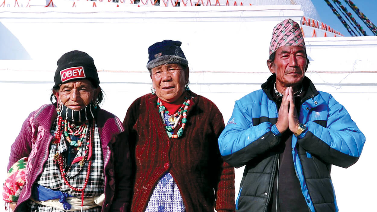Three elderly people look up with wonder and reverence, palms pressed together at the Boudhanath stupa towering over them. Sonam Yangjung Lama, Yangja Phuti, and Samten Lama (pictured, above) are from Humla, and have undertaken a once-in-a-lifetime pilgrimage to the Kathmandu shrine.