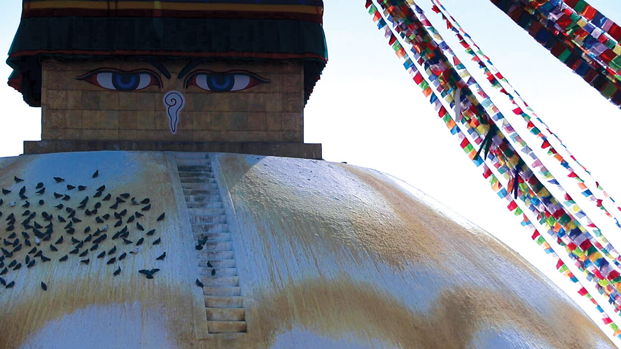 “The stupa stands on a five-layered platform, signifying the five elements of nature,” Lama explains, pointing at the imposing monument. “The dome signifies the earth, while the eyes of the Buddha represent compassion and wisdom. The 13 tiers above it are the thirteen steps to enlightenment, and the cupola signifies the protection that the dharma gives. Finally, the spire represents Nirvana.”