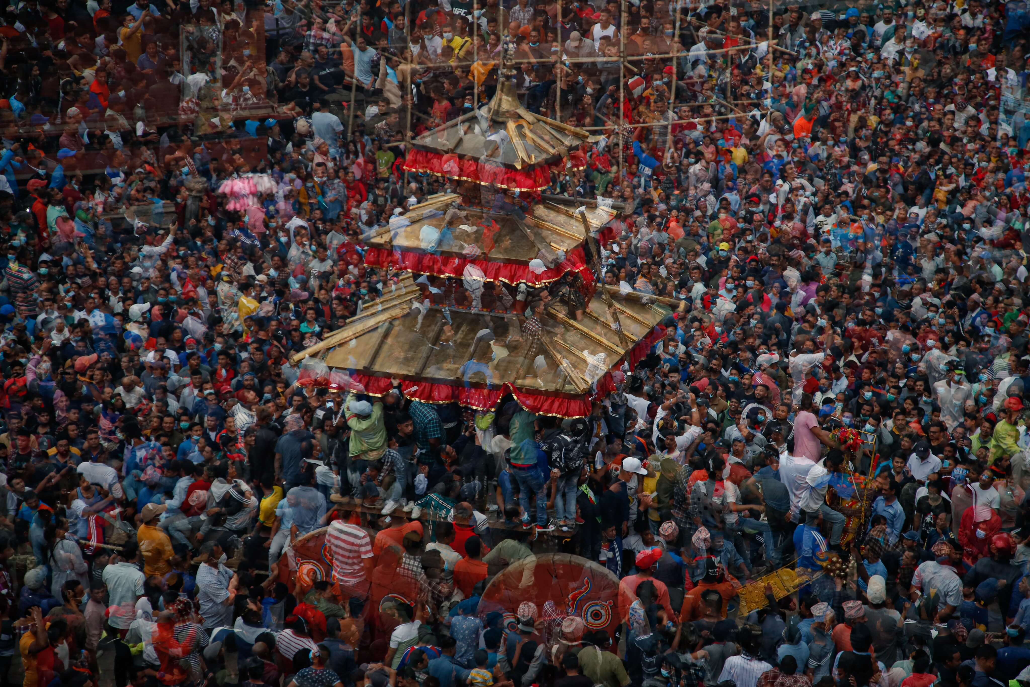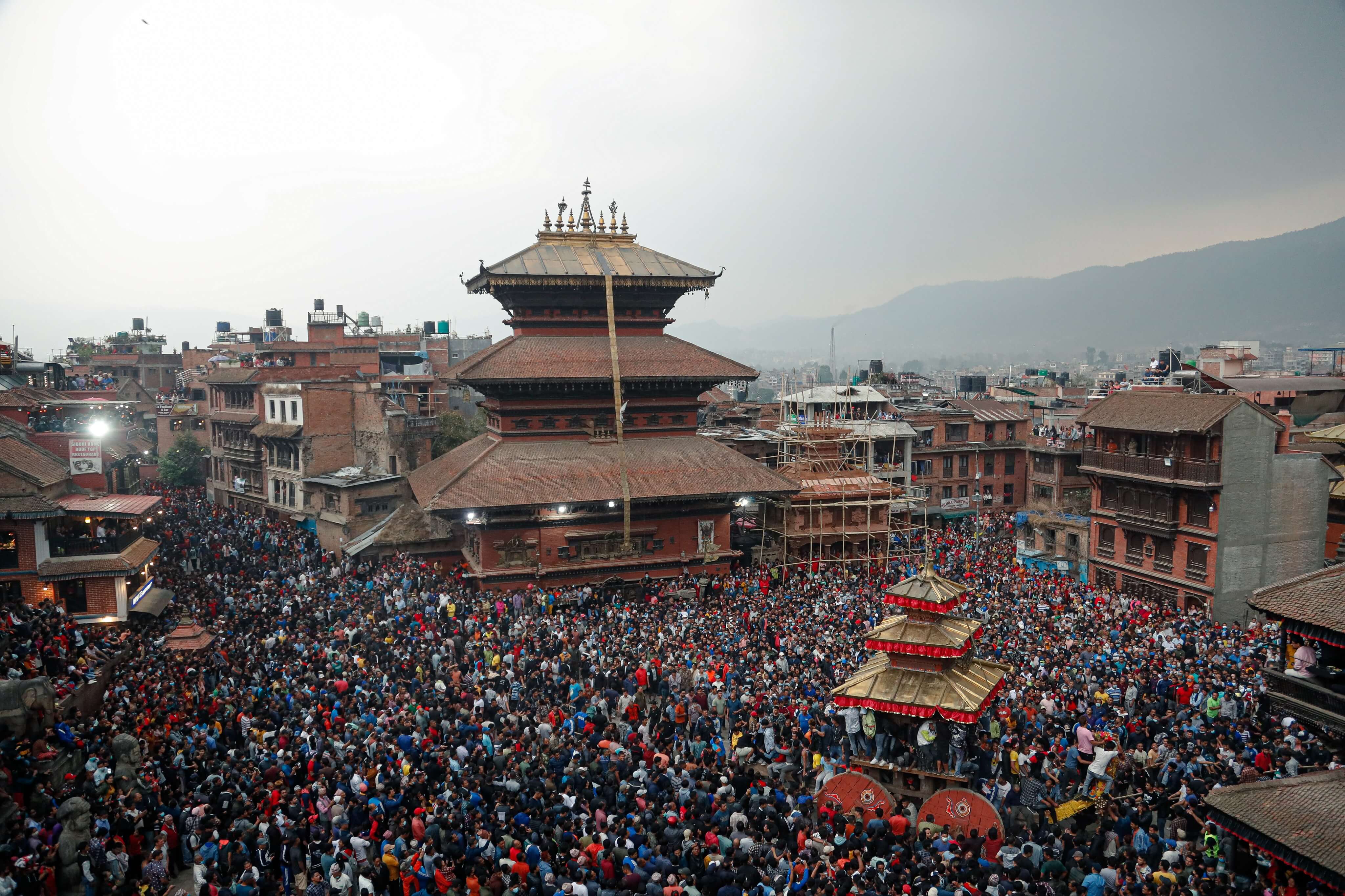 Taking place over nine days and attended by devotees from the three cities of the Valley, the celebrations start four days before 1 Baisakh, which is Nepali New Year, and end four days after, with the chariot, Bhailakha, being pulled by locals in front of the Nyatapola Temple on both days.
