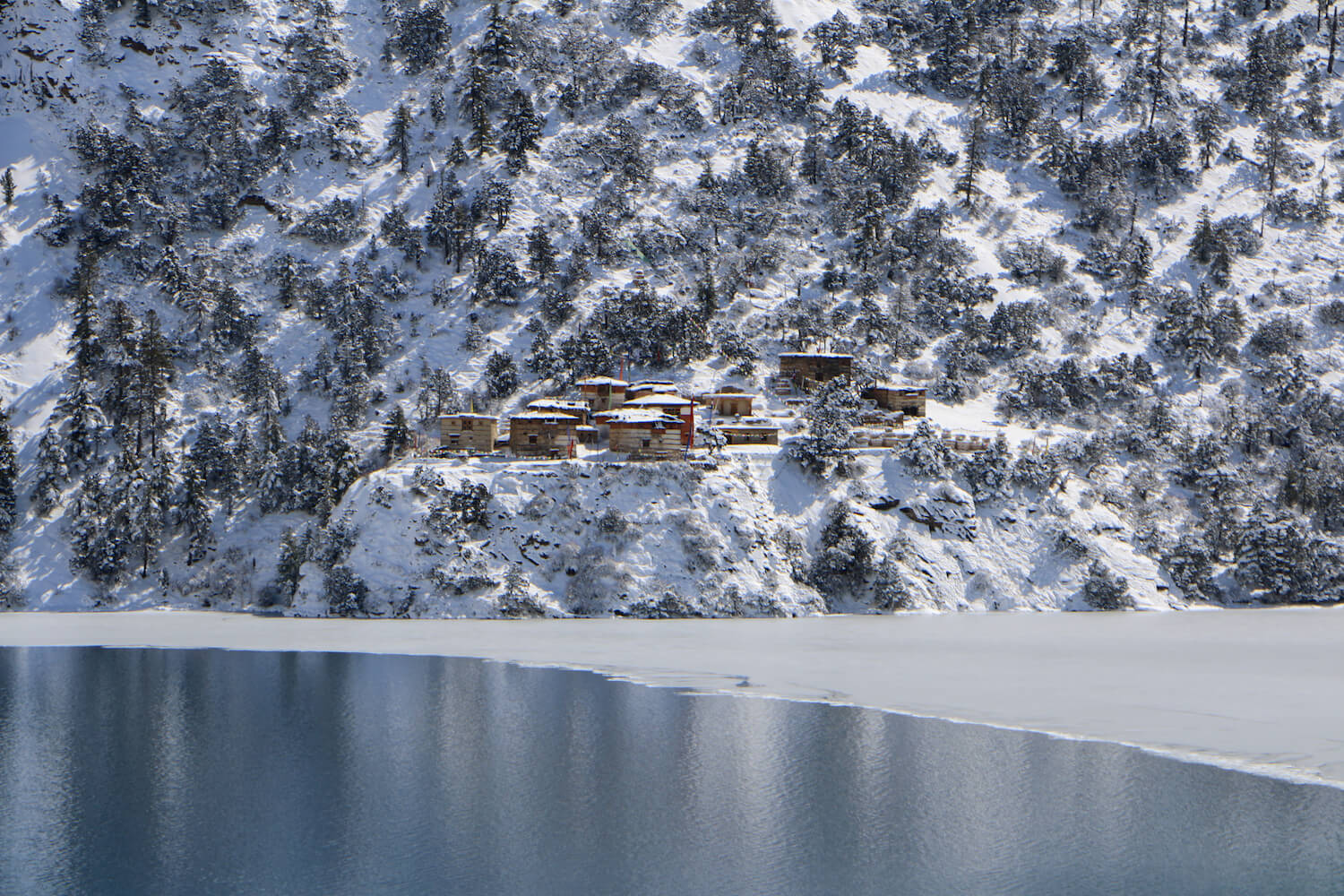 It is morning here at 4,000m, and an overnight blizzard has left everything white. All around us, the outlines of the mountains of Dolpo have been softened by new snow. Below, Phoksundo Lake is partly ice-covered.