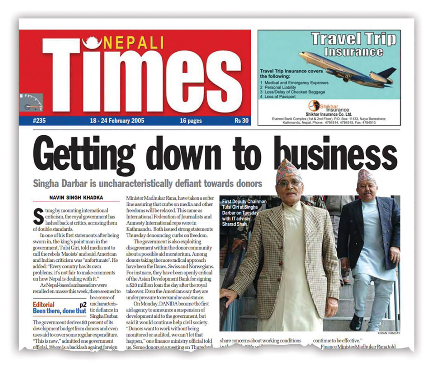 he disorientation of the Nepali Congress is beginning to show. The party was so demoralised by its election upset that it still keeps showing what a sore loser it is. The NC was always a bit lost after BP but now it suffers from acute ideological confusion. This muddle-headedness starts right at the top. In more settled times, the NC could have continued with the contradictions, but today the main challenge comes from the radical left. The NC’s right-wing leanings help the Maoists consolidate their populist agenda. The NC has to be a much more focused and disciplined party if it is to project itself as a true alternative to the Maoists.
