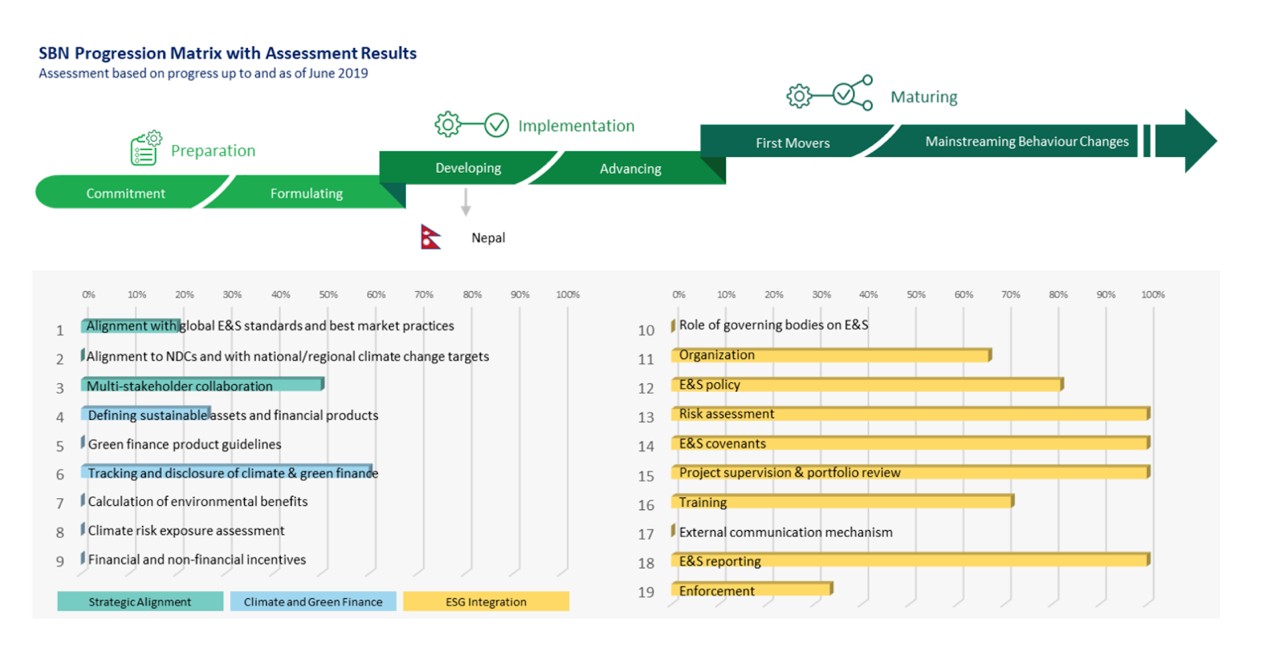 The Rastra Bank has made significant efforts in this transition. The Sustainable Banking Network reports that Nepal is making progress in developing its green finance system and has evolved from the ‘Preparation’ to ‘Implementation’ stage in recent years (see chart). The guiding force behind this has been the adoption of the ‘Guidelines on Environmental and Social Risk Management for Banks and Financial Institutions’ by Nepal Rastra Bank in 2018.
