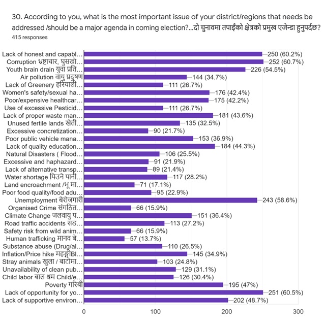 The poll is one of many that proves that Nepali youth are worried about their future, and the state of the country’s governance. It shows that they want to be active participants in resolving Nepal’s environmental and socio-economic issues since the Covid-19 pandemic and lockdowns began two years ago.