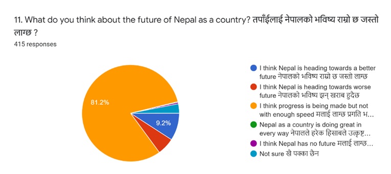 The survey also asked respondents about the future of Nepal as a country, to which 81% of respondents answered that while progress was being made, it was not happening fast enough.