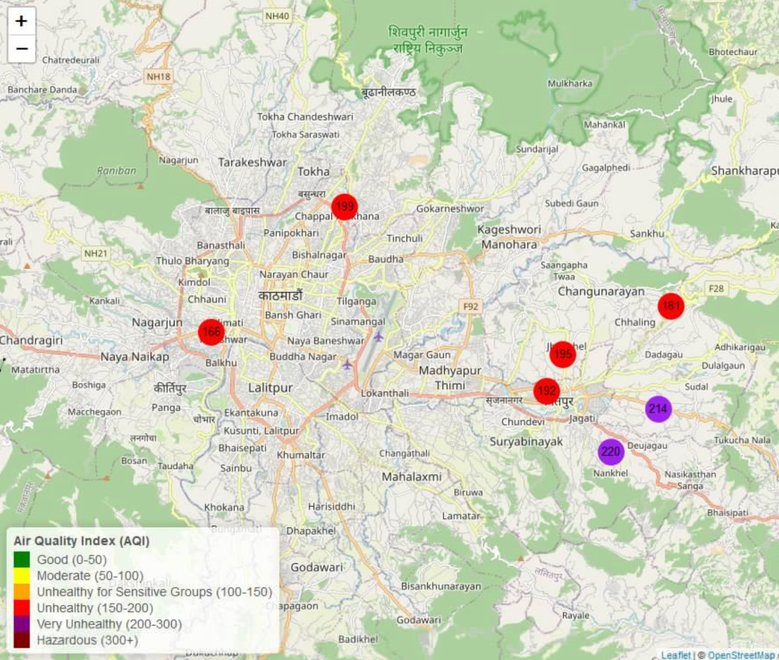 A recent Air Quality Index (AQI) measurement of 22 sites in Kathmandu Valley found Bhaktapur to have the most hazardous concentrations of suspended particles below 2.5 microns (PM2.5), aerosols and toxic gases. On 8 February, Madhyapur Thimi recorded the highest AQI at 310 closely followed by Duwakot at 296 and Sallaghari at 279. Changunarayan registered 234, Tathali 234 and Ghyakhel 246.