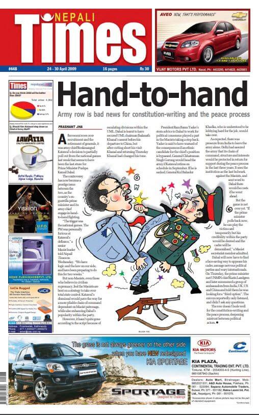 In a front page analysis titled ‘Hand-to-hand’ in issue #448 of 24-30 April 2009, columnist Prashant Jha reported on Maoist Prime Minister Pushpa Kamal Dahal’s efforts to oust the Nepal Army chief. We will see in a subsequent issue how this led to Dahal’s downfall. Ten years later, Dahal is headed for resurrection after PM Oli’s promise to step down. Excerpt: